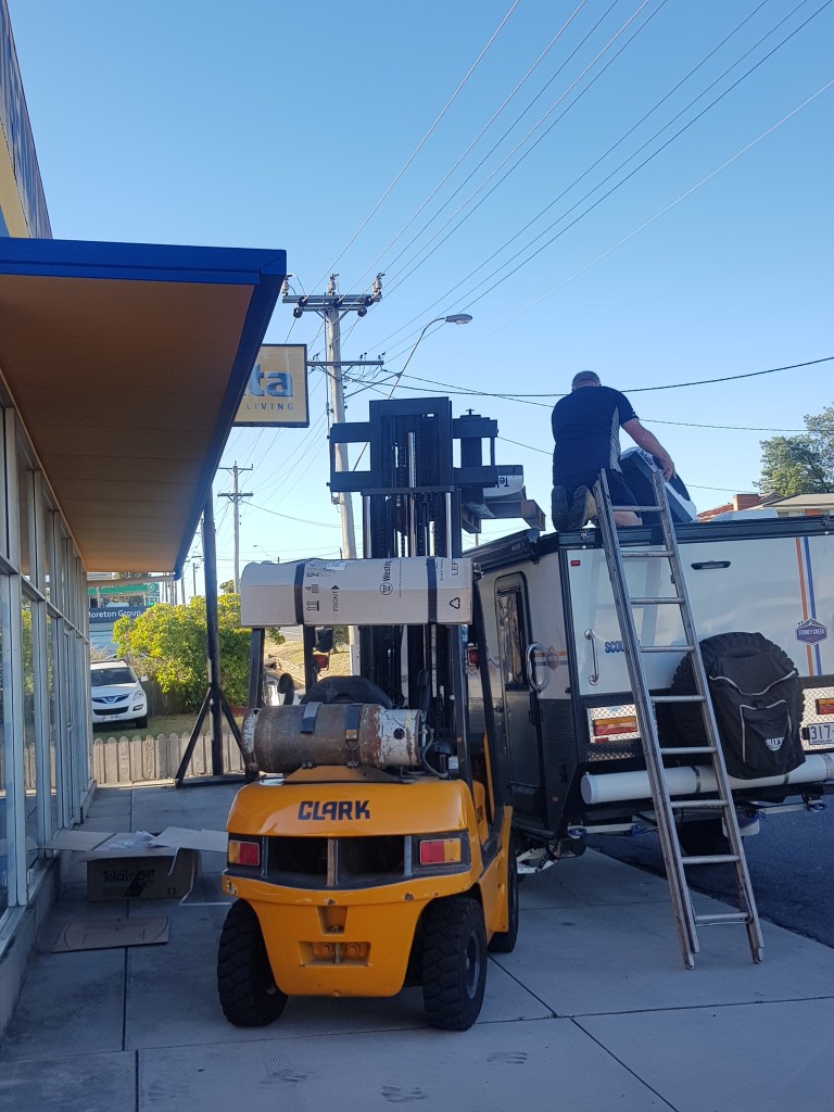 … and made it in time to the electronic appliances shop that would handle the replacement of the air conditioner – on the sidewalk in front of the building along a busy road! (Other caravans had to line up on the curb waiting for their turn.)