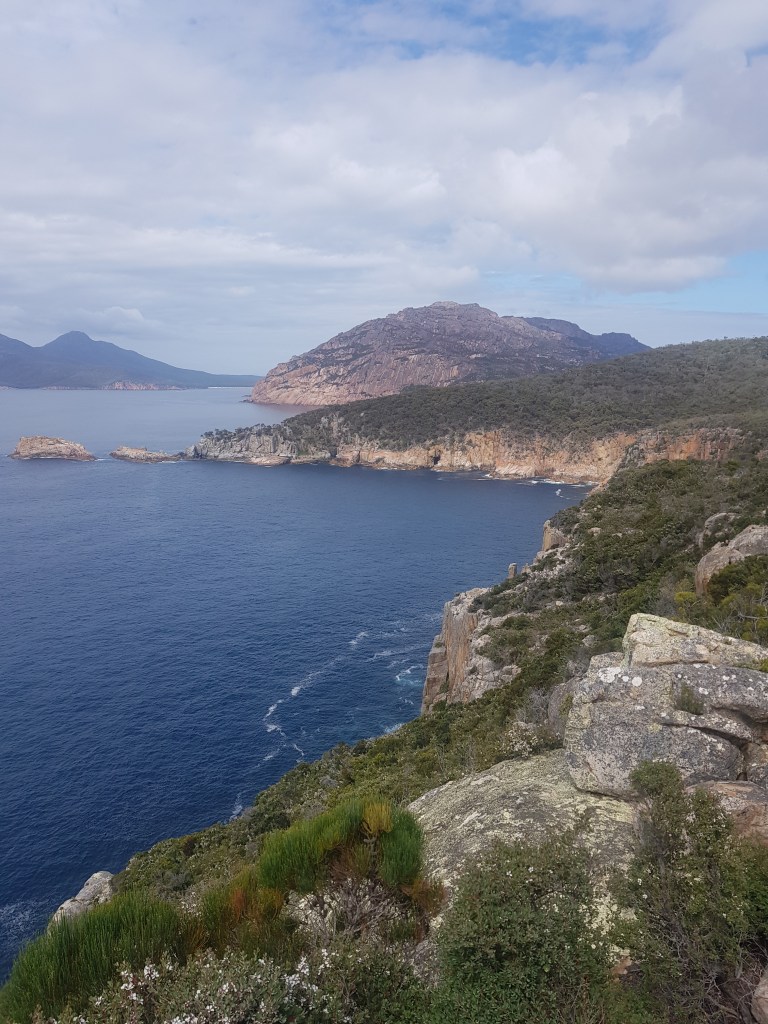Should we go or not? On the positive side, there would be less people. On the negative, we might get soaked. But we could rely an the everchanging nature of Tasmanian weather. There might be sun. And it wasn’t windy – a big plus. So we went. The carpark was only half full. The hike up the steep mountain side was beautiful in a non-postcard way. Dramatic reveals of rock formations by the shifting clouds, wet shining gums and their fragrance, glorious boulders stacked by giants. Only faint glimpses of the famous beach far down below.