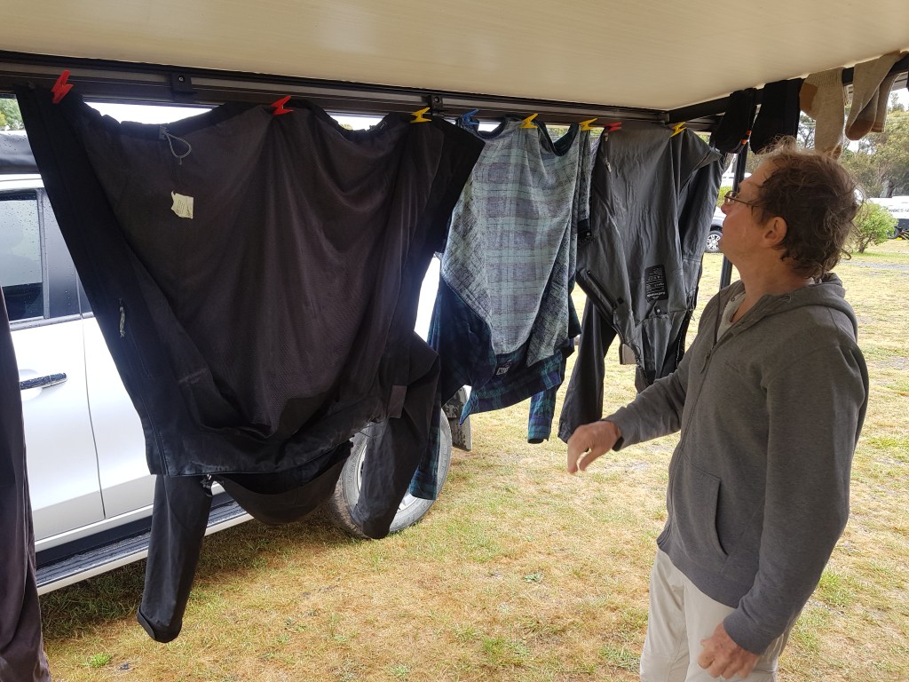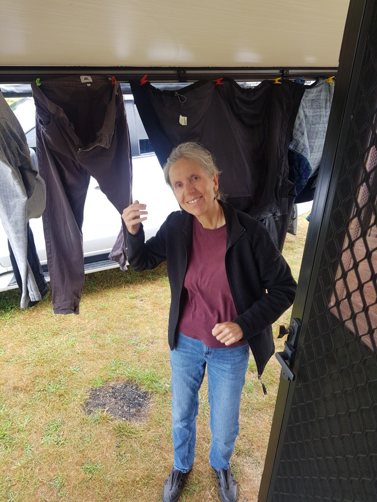 We had to change everything. Here you can see us back at our campsite. Whenever our laundry got a little dry, the next rain shower soaked it again. All day and into the night – as the forecast had said.