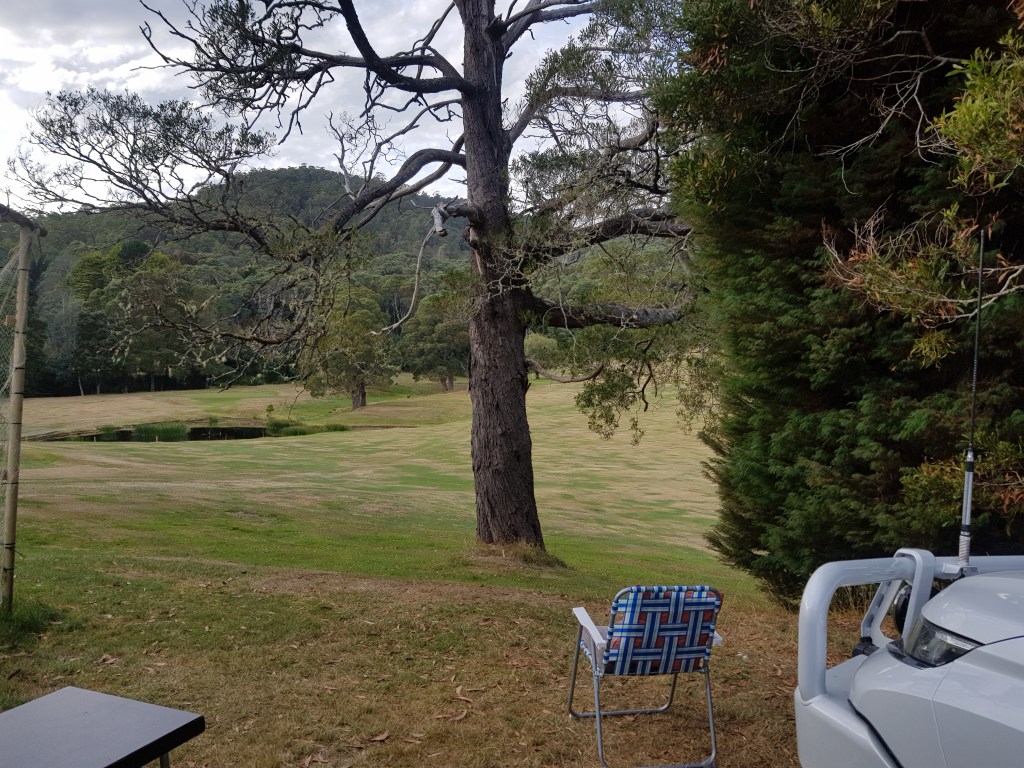 So we left Strahan and headed back into the wilderness. On winding roads, but not as bad as the road to Queenstown. The turn-off to Rosebery golf course was 7 km before town and easy to miss. A small sign and then a steep loop into a wooded hilltop, there it was: one of the steepest golf courses in the world and incredibly scenic. Only a few caravans were there and we managed to get a spot with a view.